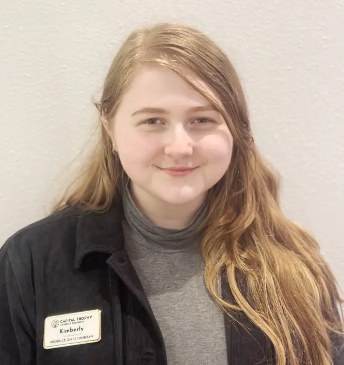 Kimberly is the newest member of the Capital Trophy team and has quickly become a valued part of daily operations. She brings a strong work ethic and a positive, adaptable approach to the shop, integrating seamlessly into the team.